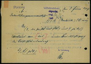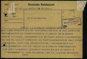3559 | 40 € | WESTZONEN / BIZONE / TRIZONE (BIS 1949) : Wilhelmshaven / Bremen 1947 (4.6.) viol. Eingangs-Ra.3 auf OPD-Dienst-Telegramm "Deutsche Reichspost" (links gelocht) + Telegr.-Verschlußmarke "DEUTSCHE REICHSPOST" (Posthorn) interess. Text über alliierte Bestimmungen im zonalen und Bizonalen Fernsprech-Verkehr aus Bremen, sehr seltenes Zeit-Dokument, in dieser Form Unikat! (Form: (12.42) C 187 a Din A 5) | ![]() | |