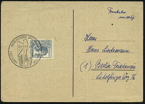 3553 | 30 € | WESTZONEN / BIZONE / TRIZONE (BIS 1949) : STUTTGART/ SOZIALISTISCHER JUGEND-TAG 1947 (Aug.) SSt = Jugend-Organisation "Die Falken" (Falke, Stadttürme) sehr seltene Sonderkarte! (Michaelis Nr.2, + 80.-DM, 1991) seltene Inl.-Karte n. West-Berlin (Bo.103) | ![]() ![]() | |