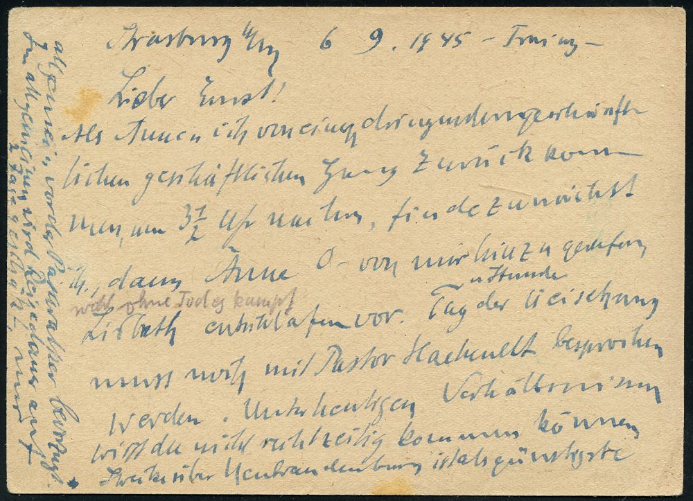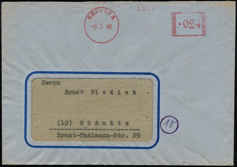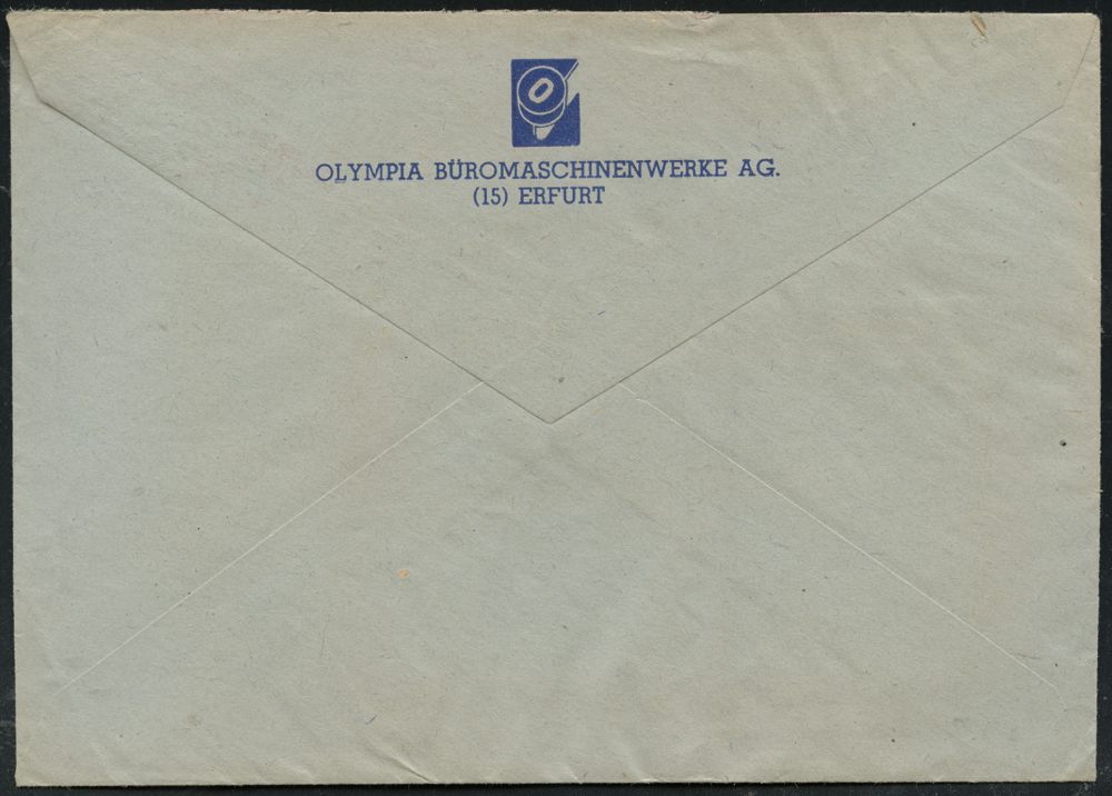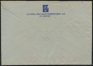 3706 | 25 € | SOWJETISCHE BESATZUNGSZONE (1945-49) : ERFURT/ 1 1946 (9.3.) total aptierter AFS "Hakenkreuz" = vom Wertrahmen nur Mittelstück + Werbeklischee entfernt = Notmaßnahme! , rs. Abs.-Vordr.: OLYMPIA BÜROMASCHINENWERKE AG (wurdde enteignet!), Fern-Bf., (Eich.E-12 M-75h = sehr seltene Type) | ![]() ![]() | |