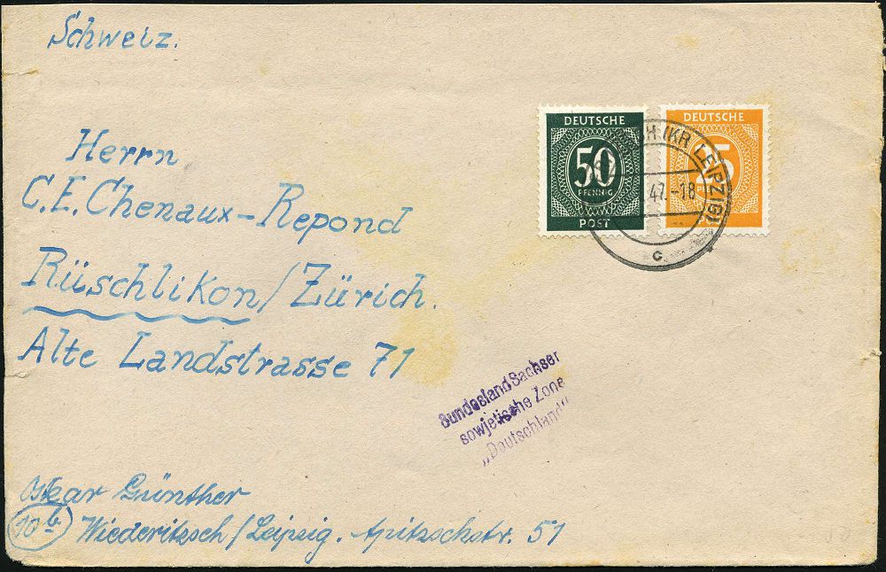 3730 | 16 € | SOWJETISCHE BESATZUNGSZONE (1945-49) : WIEDERITZSCH (KR LEIPZIG)/ c 1947 (21.2.) 2K-Steg + amtl. HdN: Bundesland Sachsen/sowjetische Zone/"Deutschland" , Bedarfs-Ausl.-Bf. (kl. Randrißchen, Fleck) n. Zürich Bundesländer wurden 1952 abgeschafft (Mi.927, 932) | ![]() | |