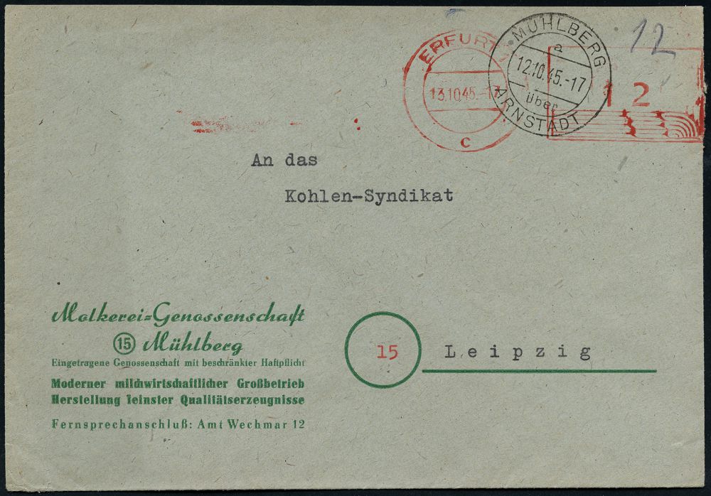 3720 | 25 € | SOWJETISCHE BESATZUNGSZONE (1945-49) : MÜHLBERG/ a/ über/ ARNSTADT 1945 (12.10.) 2K-Steg = PSt.I + hs. Barfreimachung "12" (Pf.) in Erfurt 1 nachfrankiert mit aptiertem Post-Freistempel: ERFURT 1/c ("Adlerkopf/ Hakenkreuz" = entfernt, nur Flügel) Firmen-Bf.: Molkerei-Genossenschaft (15) Mühlberg n. Leipzig, seltener Beleg! (Dü.D-8, Nr.226) | ![]() | |