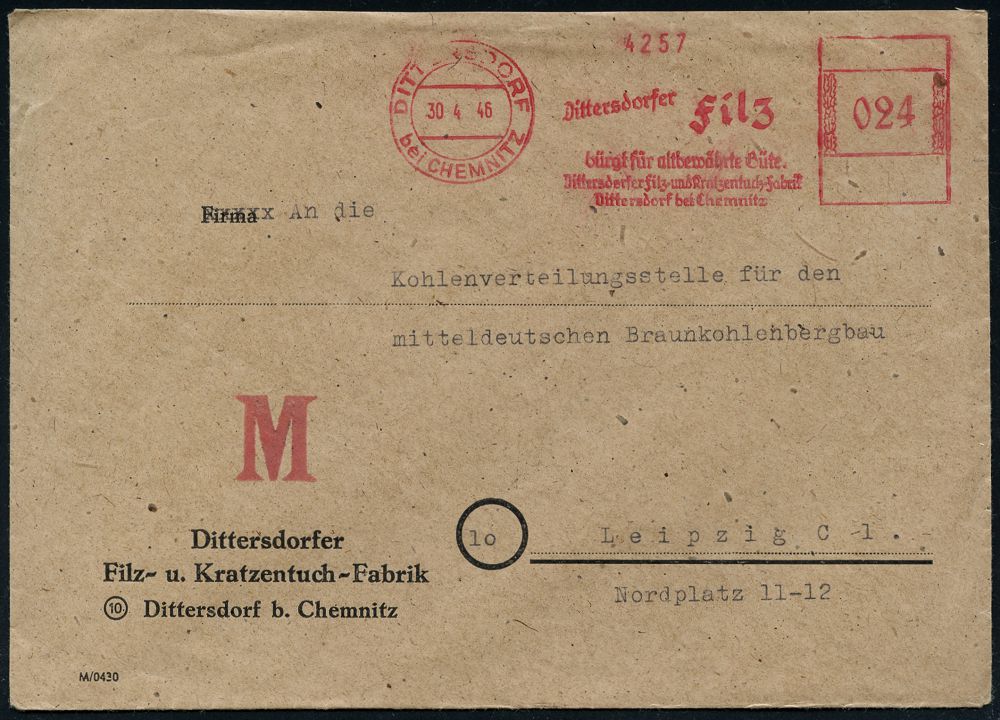 3698 | 25 € | SOWJETISCHE BESATZUNGSZONE (1945-49) : DITTERSDORF/ bei CHEMNITZ/ Dittersdorfer Filz.. 1946 (30.4.) seltener, aptierter AFS Francotyp "Hakenkreuz" = entfernt + Inschrift "Deutsches Reich" = Notmaßnahme! , Firmen-Bf.: Dittersdorfer Filz- u. Kratzentuch-Fabrik.. n. Leipzig (Dü.E-12AA-98h) | ![]() | |