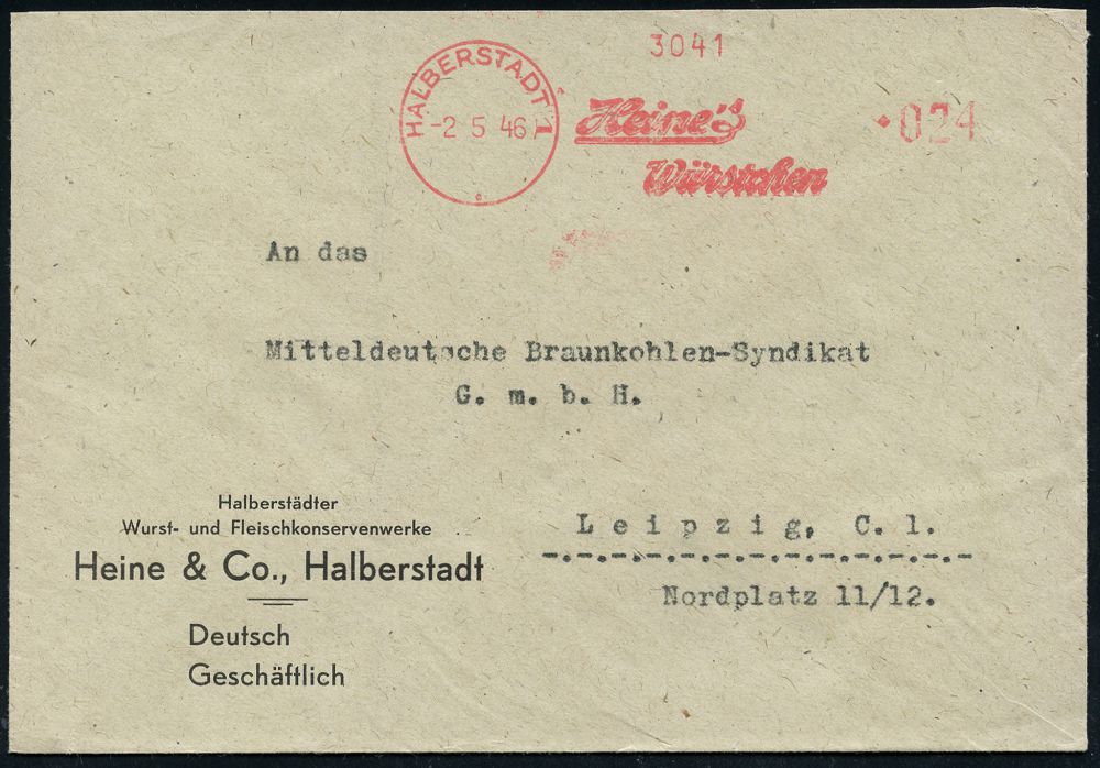 3709 | 25 € | SOWJETISCHE BESATZUNGSZONE (1945-49) : HALBERSTADT 1/ Heine´s/ Würstchen 1946 (2.5.) total aptierter AFS Francotyp = Wertrahmen kompl. entfernt = Notmaßnahme! , Firmen-Bf.: Wurst- u. Fleischkonservenwerke, Heine & Co.. n. Leipzig (Dü.E-16DGh) | ![]() | |