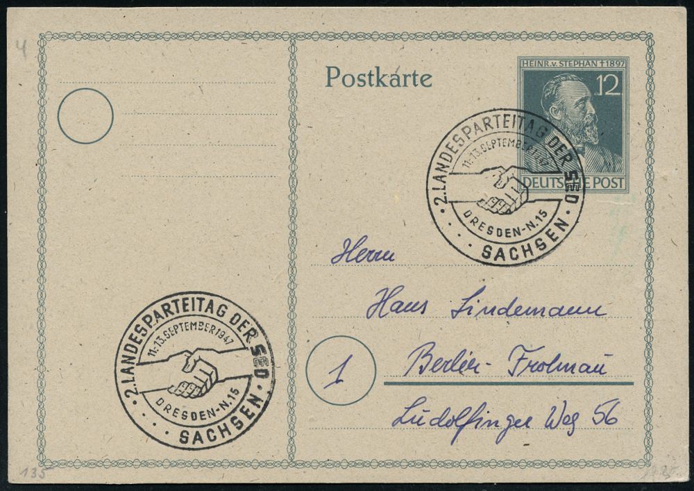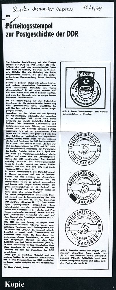 3703 | 15 € | SOWJETISCHE BESATZUNGSZONE (1945-49) : DRESDEN-N.15/ 2.LANDESPARTEITAG DER SED/ ...SACHSEN 1947 (Sept.) aptierter SSt "BU.-L" entfernt (= BUndes-Land) inl.-Karte + Kopie über die Geschichte des Stempels! (Bo.113 = aptierter Bo.112) | ![]() ![]() | |