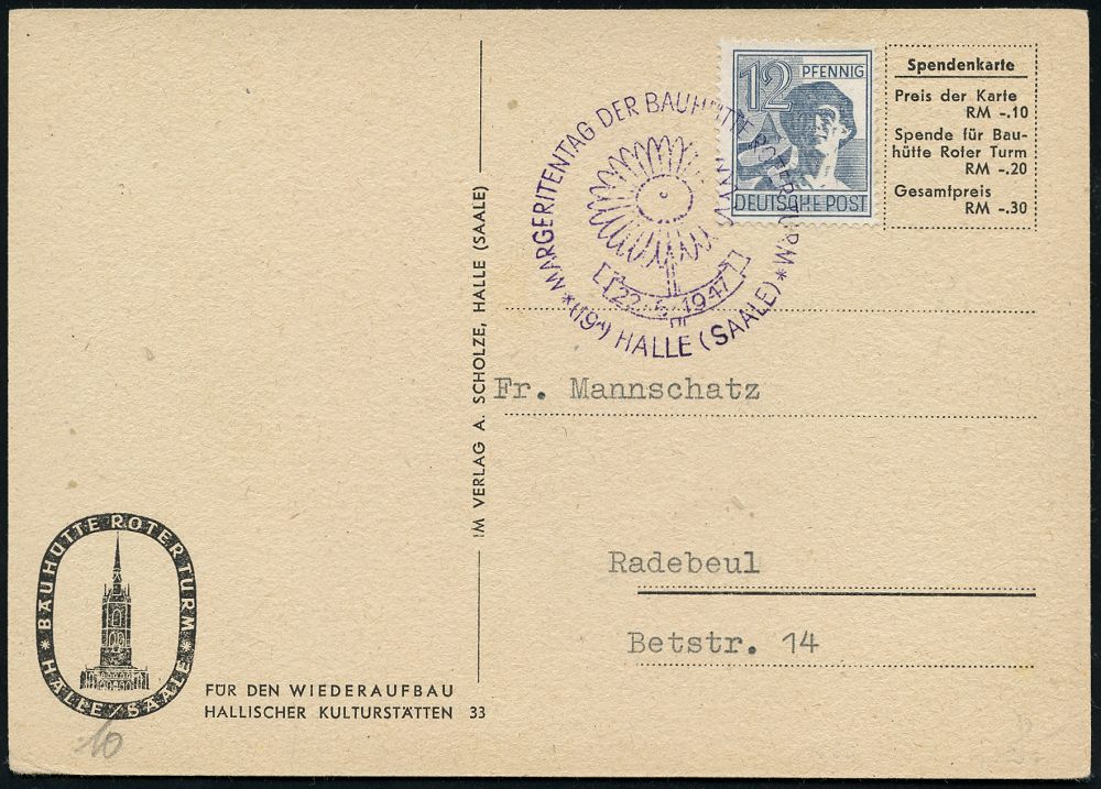 3711 | 18 € | SOWJETISCHE BESATZUNGSZONE (1945-49) : (19A) HALLE (SAALE)/ MARGERITENTAG DER BAUHÜTTE ROTER TURM 1947 (22.6.) seltener, viol. SSt auf Spenden-Kt.: ROTER TURM.. WIEDERAUFBAU (Michealis Nr.2, + 30.- DM, 1991) Fern-Kt. (Bo.35, violett) | ![]() ![]() | |