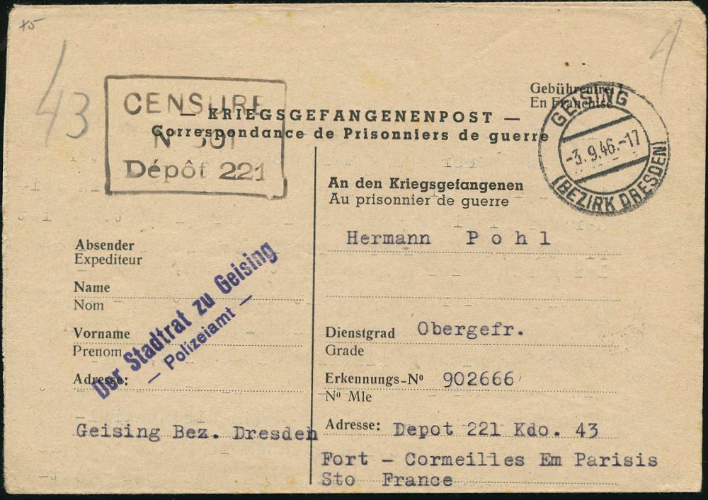 3707 | 18 € | SOWJETISCHE BESATZUNGSZONE (1945-49) : GEISING/ (BEZIRK DRESDEN) 1946 (3.9.) 2K-Steg + viol. 2L: Der Stadtrat Geising/ Polizeiamt , Kgf.-Vordruck-Bf. (deutsch-französ. Vordruck) interss. Inhalt: über Flüchtlinge aus Teplitz an dt.Kgf.-Lager Ft. Corneilles, Frankreich, Ra.3: CENSURE/No 501/Dépôt 221, seltener Beleg | ![]() ![]() | |