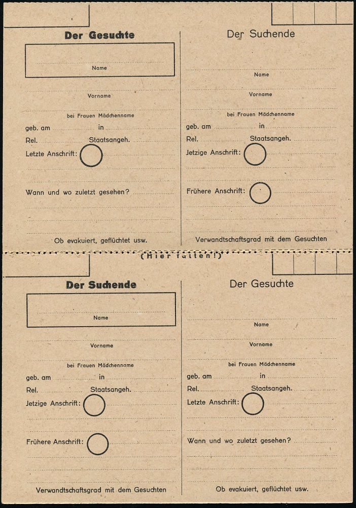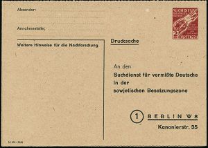 3732 | 12 € | SOWJETISCHE BESATZUNGSZONE (1945-49) : S.B.Z. 1946 Doppel-Suchdienst-P 2 RM "Suchdienst für vermißte Deutsche in der SBZ" mit Durchstich , ungebr., (Mi. SDP 1 a) | ![]() ![]() | |