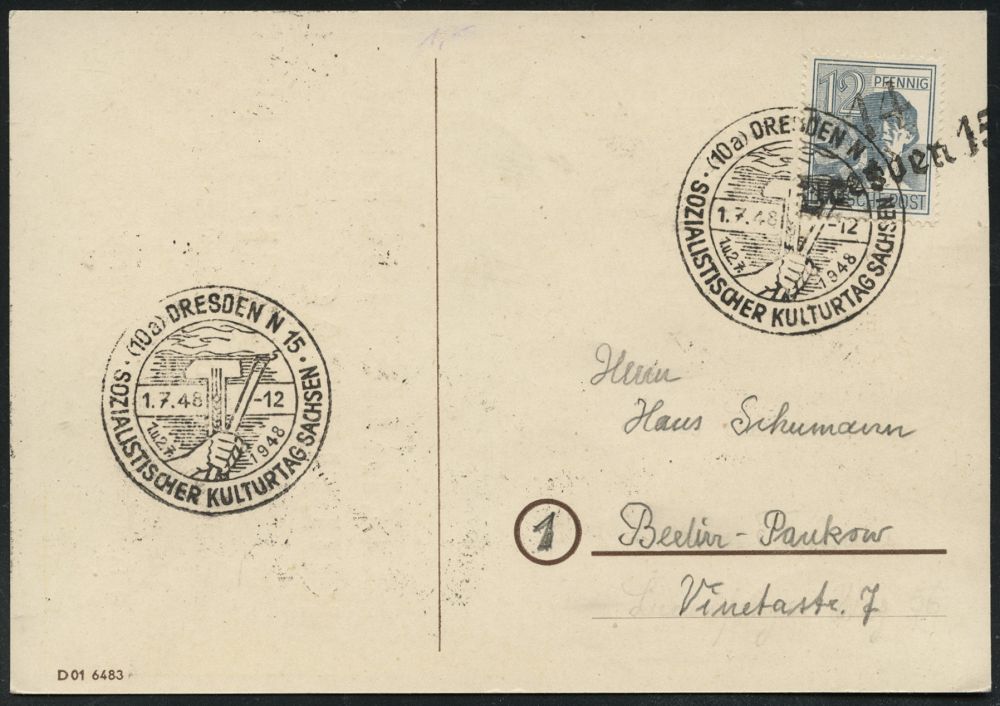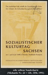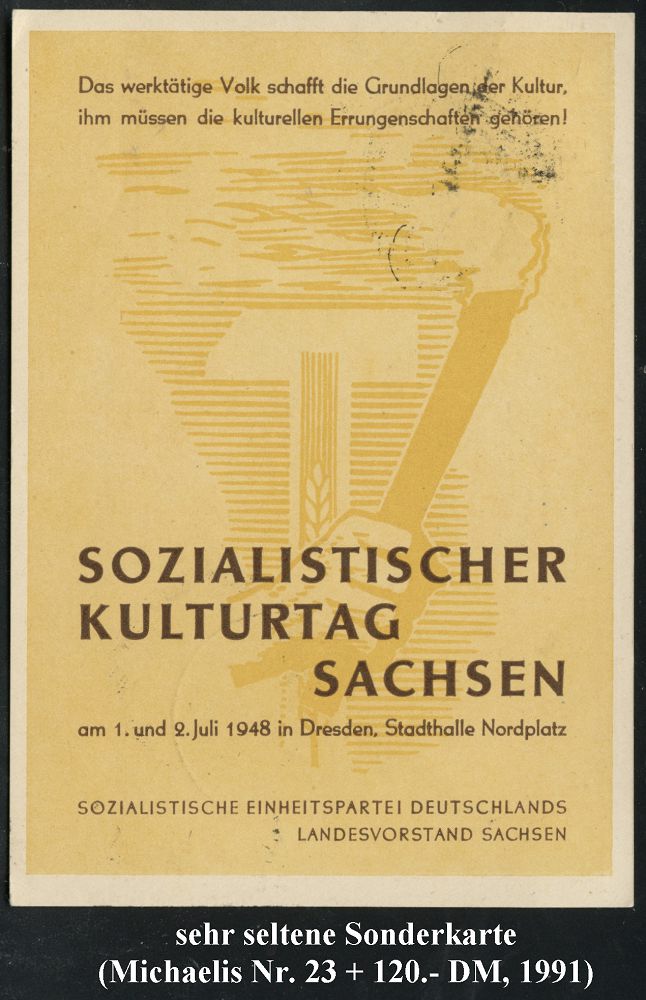3705 | 50 € | SOWJETISCHE BESATZUNGSZONE (1945-49) : (10a) DRESDEN N 15/ SOZIALISTISCHER KULTURTAG SACHSEN 1948 (1.7.) SSt = Hand mit Hammer u. Fackel auf EF 12 Pf. Arbeiter mit Bezirks-Handstpl. "14/ Dresden 15" (Mi.170 EF + 40.- EUR = Währungsreform) sehr seltene, motivgleiche Sonder-Kt. (Michaelis Nr.23 + 120.- DM, 1991) klar gest. Inl.-Karte (Bo.123) | ![]() ![]() | |
