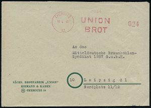 3699 | 20 € | SOWJETISCHE BESATZUNGSZONE (1945-49) : CHEMNITZ/ 13/ UNION/ BROT 1946 (11.4.) total aptierter AFS Francotyp = Wertrahmen kompl. entfernt = Notmaßnahme! , Firmen-Bf.: SÄCHS. BROTFABRIK "UNION", REIMANN & KADEN.. n. Leipzig (Dü.E-16CGh) | ![]() ![]() | |