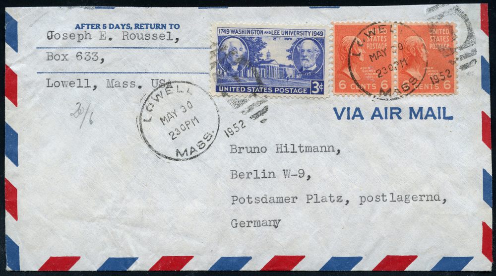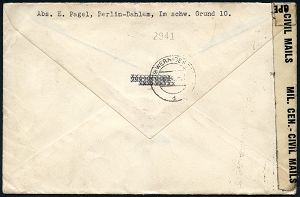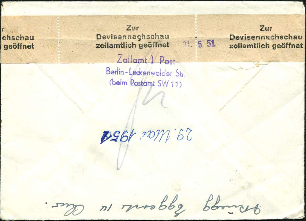 3976 | 16 € | GESCHICHTE VON BERLIN : Berlin / USA 1951 (Mai) viol. 3L: Zollamt I Post/Berlin-Luckenwalder Str./(beim Postamt SW 11) a. Devisen-Zensurstreifen: Zur/ Devisennachschau/ zollamtlich geöffnet (rs.) Frankatur U.S.A. 15 C.-Flp.-Frankatur, Ausl.-Devisen-Zensur-Bf. aus den USA ! (Mi.533 MeF) | ![]() ![]() | |