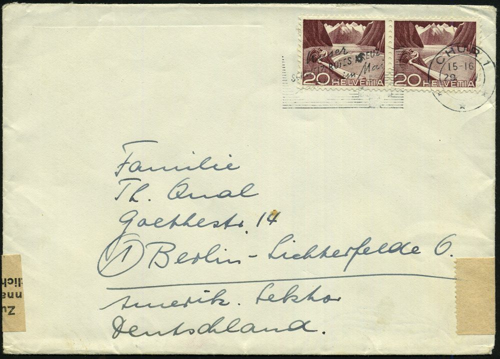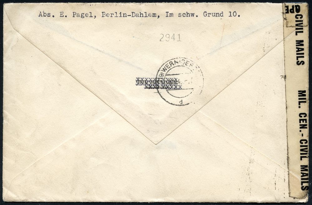 3953 | 18 € | GESCHICHTE VON BERLIN : BERLIN-/ DAHLEM 1946 (2.2.) 1K-Brücke auf Kontrollrat EF 84 Pf. + RZ: Berlin-Dahlem/l + US-Zensur-Streifen: OPENED BY/MIL. CENS.- CIVIL MAILS + schw. Zensur-1K: PASSED/30118 = Berlin (Rie.A-2) rs. Paginier-Nr.: 2941, Inl.-Zensur-R-Bf. in die SBZ (Mi.936) | ![]() ![]() | |