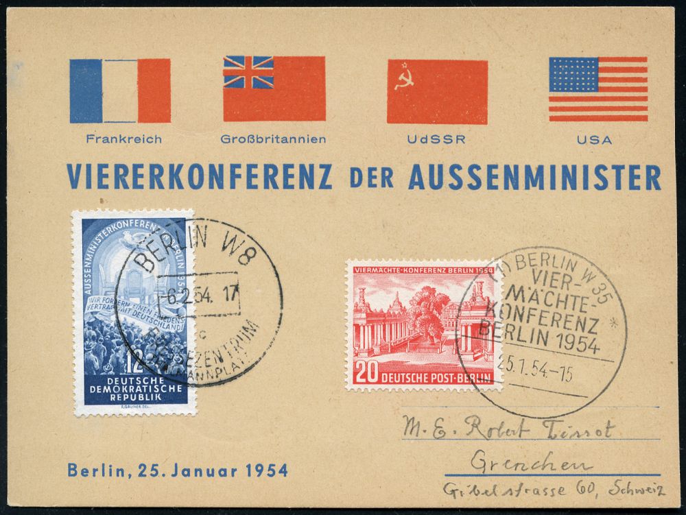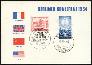 3980 | 25 € | GESCHICHTE VON BERLIN : (1) BERLIN W35/ VIER-/ MÄCHTE-/ KONFERENZ 1954 (25.1.) SSt auf MiF 20 Pf. 4-Mächte-Konferenz (Mi.116) + DDR 12 Pf. 4-Mächte-Konferenz (Mi.424) + passender SSt: BERLIN W8/c/PRESSEZENTRUM/THÄLMANNPLATZ vom 5.2. auf Sonderkarte: VIERERKONFERENZ.. (Michaelis Nr.82 b + 25.- DM, 1991) bräunliches Papier, seltene Ausl.-Kt. (Bo.614 + 618 c , nach wenigen Stunden verboten!) | ![]() | |