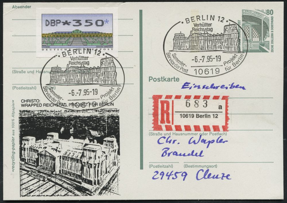 4005 | 18 € | GESCHICHTE VON BERLIN : 10619 BERLIN 12/ Verhüllter/ Reichstag 1995 (6.7.) SSt auf Inl.-P 80 Pf. Burgen + Zudruck: Verhüllter Reichstag von Christo + Zusatzfrank. ATM 350 Pf. + RZ: 10619 Berlin 12/a, Inl.-R-Kt.!, sehr kleine Auflage! (Mi.PZD 162) | ![]() | |