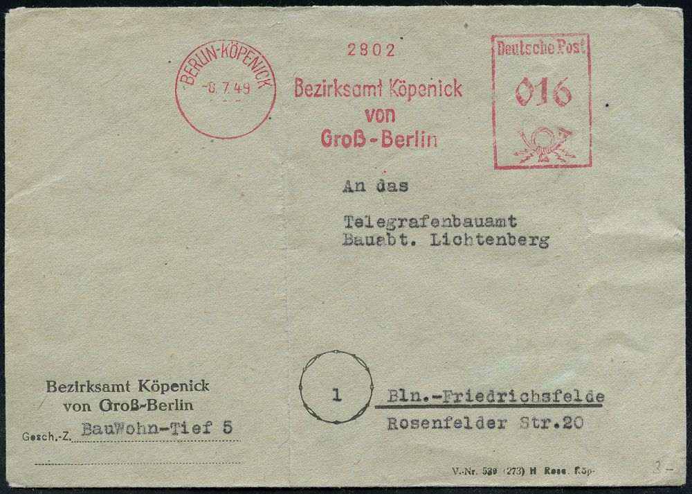 3965 | 18 € | GESCHICHTE VON BERLIN : BERLIN-KÖPENICK/ Bezirksamt Köpenick/ von/ Groß-Berlin 1949 (8.7.) AFS Francotyp "Posthorn" + rs. seltene Propanga-Vignette: PREISSTELLE DES BEZIRKSAMTES KÖPENICK, BEKÄMPFT SCHIEBER U. WUCHER.. (Figur bändigt kapitalistische Schlange) gefalteter Orts-Dienst-Bf. (Dü.E-20BAh) | ![]() ![]() | |