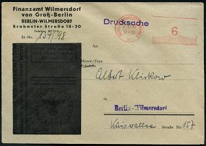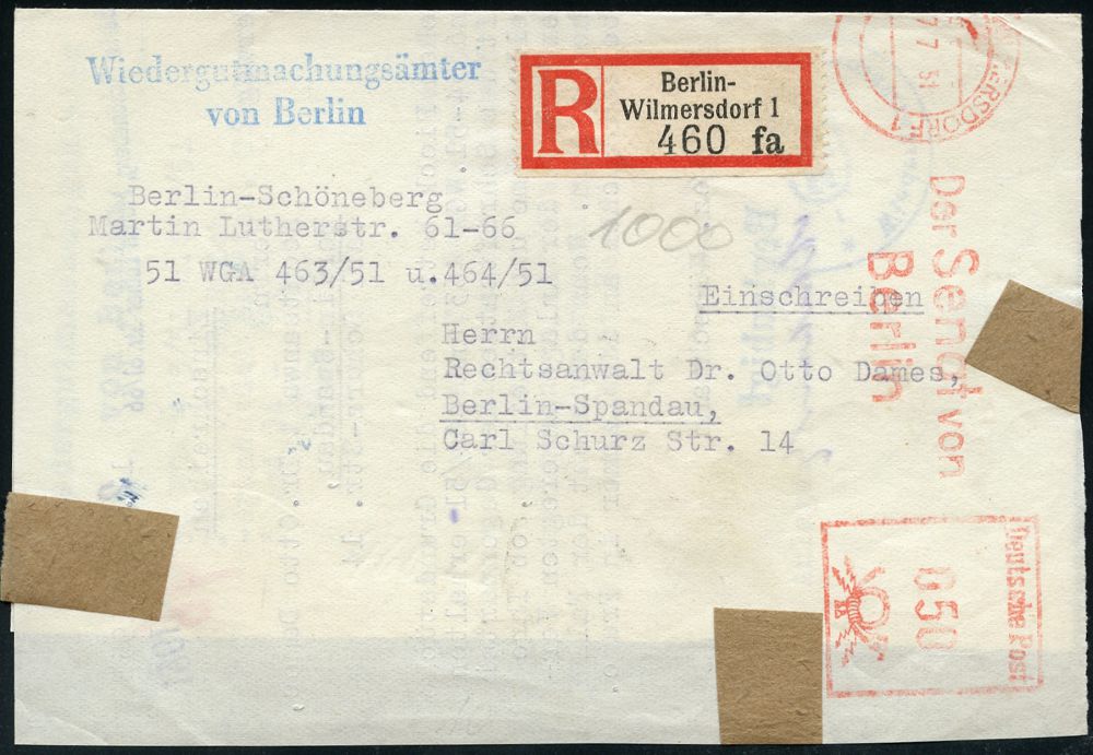 3972 | 25 € | GESCHICHTE VON BERLIN : (1) BERLIN-WILMERSDORF 1/ Der Senat von/ Berlin 1951 (17.7.) AFS Francotyp 050 Pf. (formatbedingt links ganz voll) RZ: Berlin-/Wilmerdsorf 1/ f a + Abs.-2L: Wiedergutmachungsämter/von Berlin = Entschädigungsamt für NS-Verfolgte u. NS-Opfer, Falt-Orts-R-Bf. mit Inhalt (über Grundstück in Berlin-Spandau) | ![]() ![]() | |