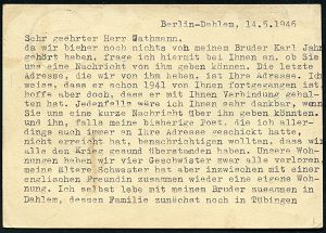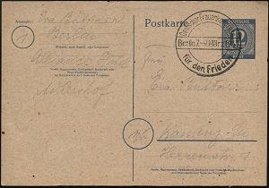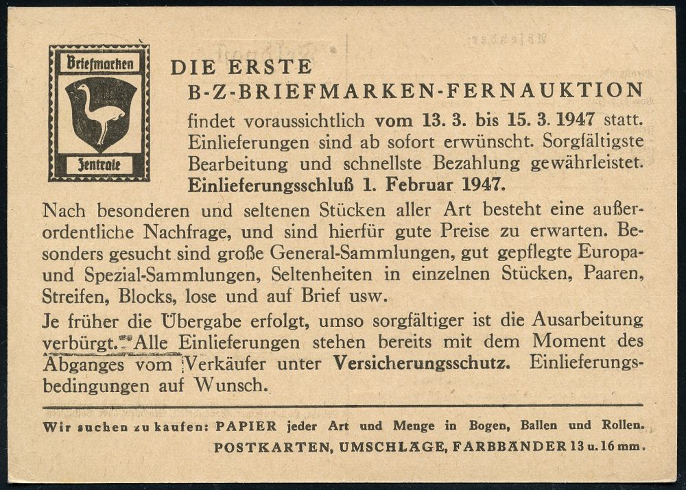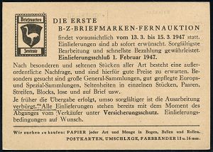 3954 | 25 € | GESCHICHTE VON BERLIN : BERLIN SW 11/ am 1946 (24.12.) aptierter PFS "Adlerkopf" (Hakenkreuz u. Inschrift "Deutsches Reich" entfernt) 6 Pf. = West-Berlin! auf Reklame-Kt.: 1. BZ-Briefmarken-Fernauktion, (3) Crivitz i. Meckl. = SBZ ! (ehem. Feldpost-Vordruck!) n. Stuttgart, = "rübergebrachte Post" aus der SBZ, seltene Kombination! (Dü.D-8, Nr.229) | ![]() ![]() | |