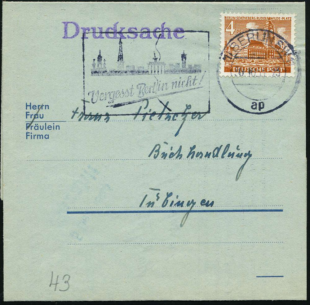 3950 | 15 € | GESCHICHTE VON BERLIN : BERLIN N4/ af/ Vergiß nicht Straße/ u.Hausnummer.. 1946 (7.1.) Serien-MWSt auf EF 8 Pf. Bärenmarke, gez. ,entnazi-fizierter NS-Bf.: REICHSNÄHRSTAND BLUT U.BODEN, überklebet + 1L: Magistratsdruckerei, Orts-Bf. Ost- n. West-Berlin! (Mi.3 A) | ![]() | |