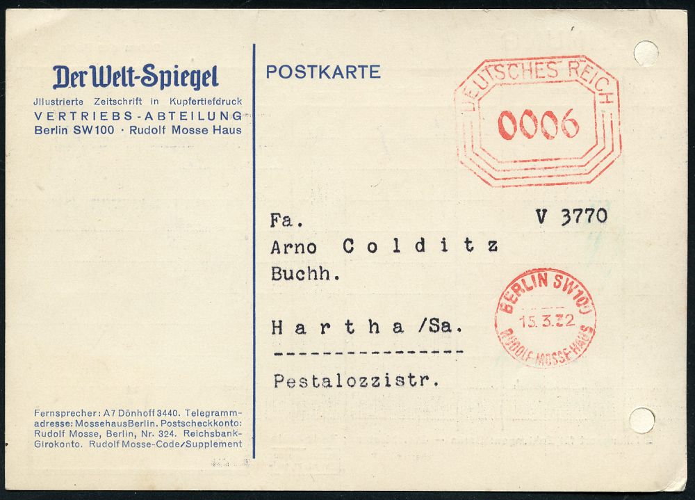 3939 | 18 € | GESCHICHTE VON BERLIN : BERLIN SW 100/ RUDOLF-MOSSE-HAUS 1932 (15.3.) AFS-Vorläufer "Bafra", vierstellig mit Vertikalachse = Hauspostamt Rudolf Mosse-Haus (= jüdischer Zeitungskonzern, von den Nazis enteignet u. gleichgeschaltet) Firmen-Kt.: Der Welt-Spiegel (Reg.-Lochung geschl.) Fern-Kt. (Dü.E-VIII, Nr.35 q) | ![]() | |