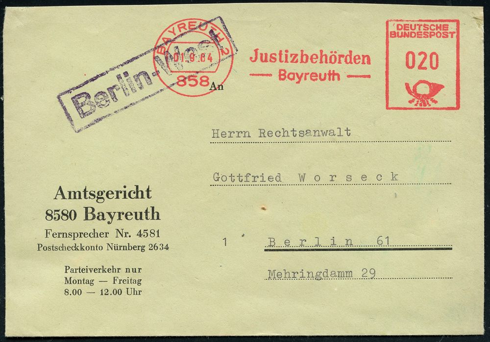 4006 | 16 € | GESCHICHTE VON BERLIN : 858 BAYREUTH 2/ Justizbehörden.. 1964 (1.9.) AFS Francotyp + viol. Ra.: Berlin-West , Dienst-Bf.: Amtsgericht.. (kl. Eckkerbe) n. West-Berlin (Dü.E-23CO) | ![]() | |