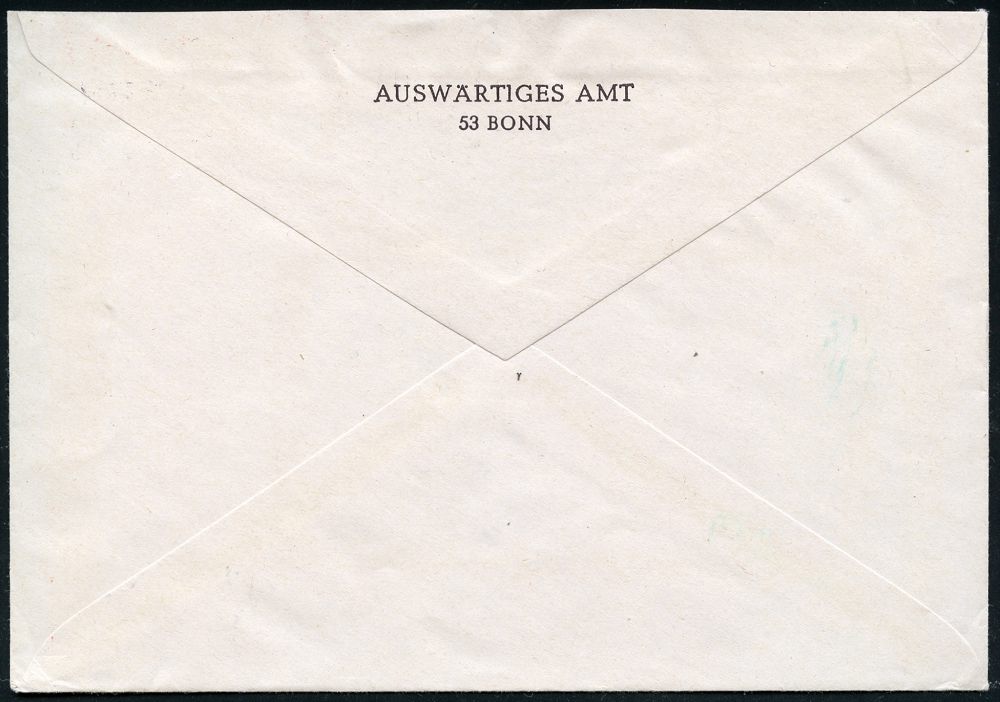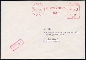 4007 | 18 € | GESCHICHTE VON BERLIN : 53 BONN 1/ AUSWÄRTIGES/ AMT 1963 (25.10.) AFS Francotyp + rotviol. Ra.: W e s t , rs. Abs.-Vordruck: AUSWÄRTIGES AMT BONN, Dienstr-Bf. n. West-Berlin an die BfA (Dü.E-23DO) | ![]() ![]() | |