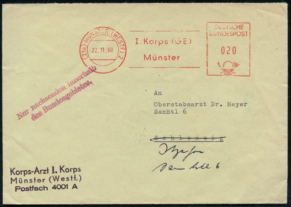 4012 | 16 € | GESCHICHTE VON BERLIN : (21a) MÜNSTER (WESTF) 2/ I.Korps (GE)/ Münster 1960 (22.11.) AFS Postalia + viol. Abs.-3L: Korps-Arzt I. Korps.. + viol. 2L: Nur nachsenden innerhalb/des Bundesgebietes. (Berlin unterlag nicht der bundesdeutschen Wehrhoheit !) nachgesandter Bundeswehr-Dienst-Bf. n. Itzehoe, vergl. Los 4013 (Dü.E-23B) | ![]() | |