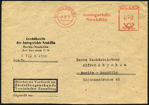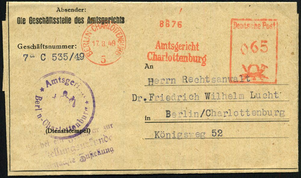 3966 | 16 € | GESCHICHTE VON BERLIN : BERLIN-CHARLOTTENBURG/ 5/ Amtsgericht.. 1949 (17.8.) AFS Francotyp 065 Pf. + viol. 3L: .. Zustellungsurkunde/Vereinfachte Zustellung , Justiz-Falt-Bf. mit Inhalt (Gerichtsverhandlung) Orts-Zustellurkunde, seltenes Porto (Dü.E-20BAh) | ![]() | |