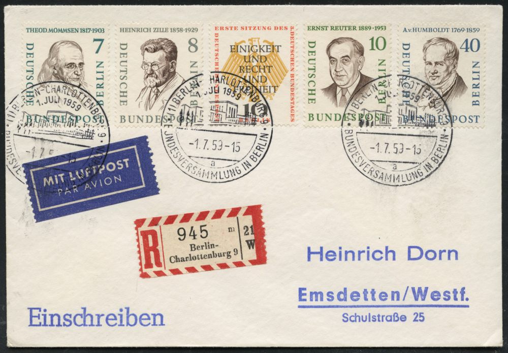3987 | 20 € | GESCHICHTE VON BERLIN : (1) BERLIN-CHARLOTTENBG.9/ a/ BUNDESVERSAMMLUNG IN BERLIN 1959 (1.7.) SSt (Messegelände = Ort der Sitzung) 3x auf 10 Pf. Reuter, 40 Pf. Humboldt etc. (Mi.163/65,171 u.a.) + RZ: Berlin-/Charlottenburg 9/m, Inl.-Flp.-R-Bf.! (Bo.882 a) | ![]() | |