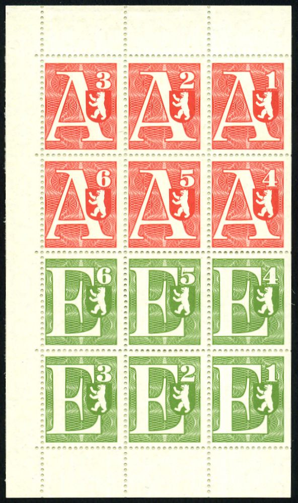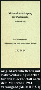 3989 | 15 € | GESCHICHTE VON BERLIN : BERLIN 1961 amtl. Paket-Zulassungsmarken "A" und "E" mit berliner Wappen für eine mögliche Berlin-Blockade nach dem Mauerbau August 1961 , postfr. Zusammendrucke (10 Stückrot u. grün) in amtl. Markenheftchen (Mi.PZ I, enthält MH Nr. PZ 1) | ![]() ![]() | |