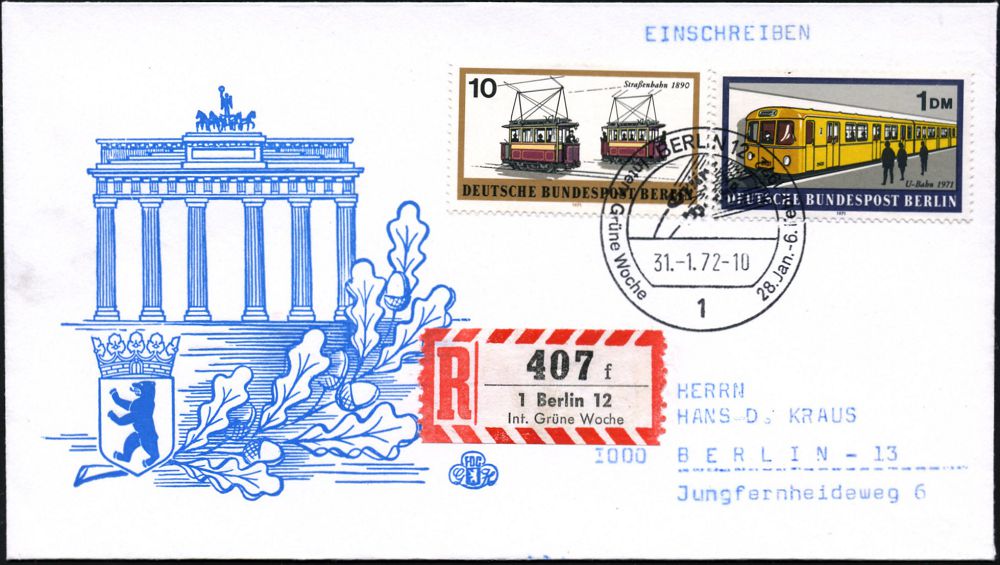 3994 | 20 € | GESCHICHTE VON BERLIN : 1 BERLIN 12/ Int.Grüne Woche..1972 1972 SSt + Sonder-RZ: 1 Berlin 12/f/Int. Grüne Woche (Nr.98/II.Verwend., UB "f") auf Inl.-R-Bf., Aufl. nur 390 Belege insges.!, = größte Agrar-Messe Deutschlands u. Europas! (Bo.1625) | ![]() | |