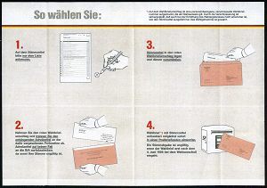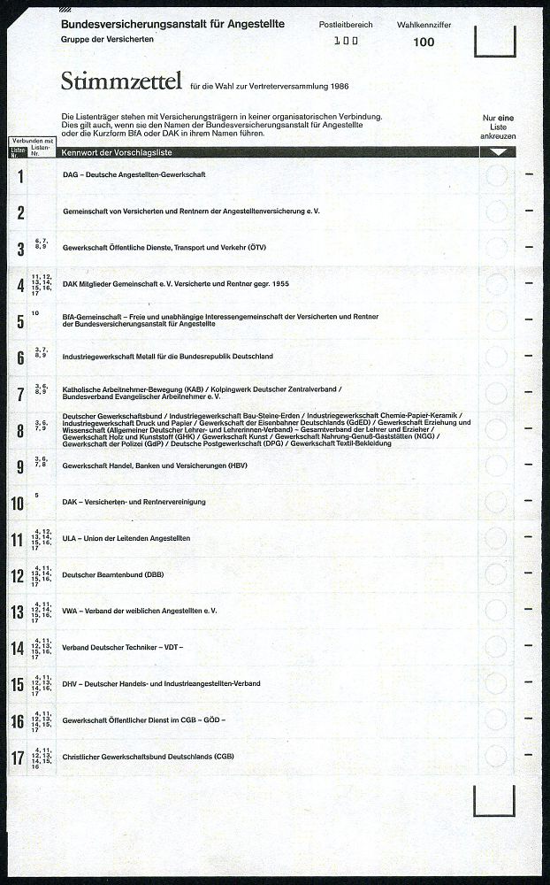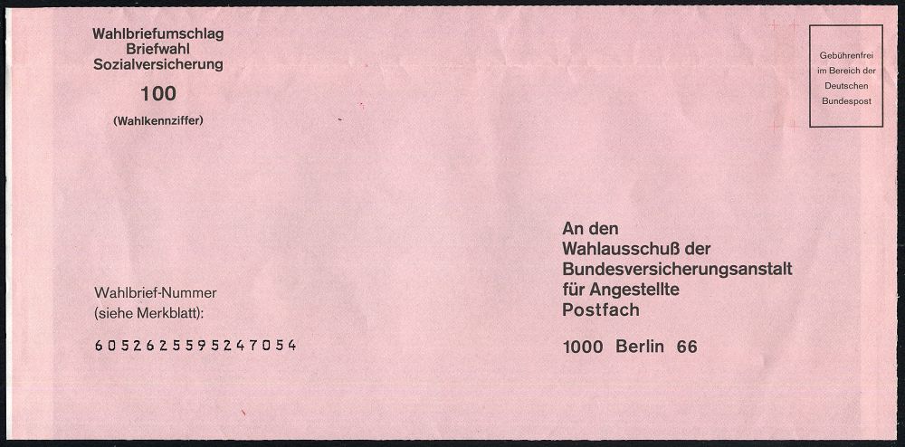 3998 | 18 € | GESCHICHTE VON BERLIN : 1000 Berlin 66 1986 rosa, portofreier Wahlbrief-Umschlag für die Sozialversicherungs-Briefwahl + Inhalt: unfrankierter Nachgebühr-Bf. der BfA, Merkblatt u. orig. Stimmzettel (ungebr.) 4 Belege komplett ! | ![]() ![]() ![]() ![]() | |