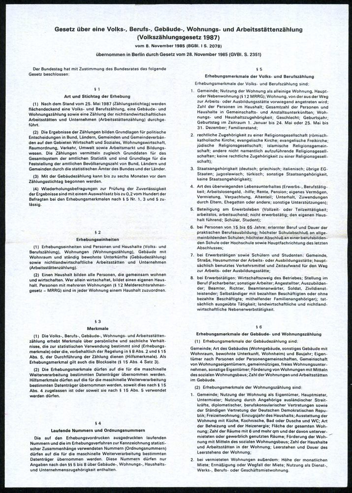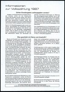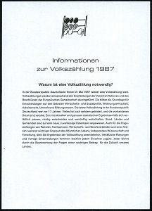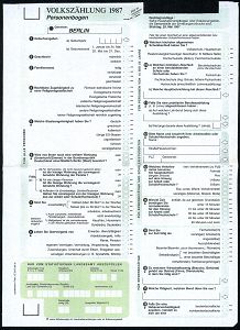 3999 | 18 € | GESCHICHTE VON BERLIN : 1000 Berlin 65 1987 blauer, portofreier Antwort-Umschlag: VOLKSZÄHLUNG 1987 "Antwort" + Inhalt: Volkszählung "Personenbogen" kompl., ungebr. + 2 Info-Broschüren "Informationen zur Volkszählung" (oben kl. Riß) zus. 8 Seiten, insges. 4 Belege komplett ! | ![]() ![]() ![]() ![]() ![]() | |
