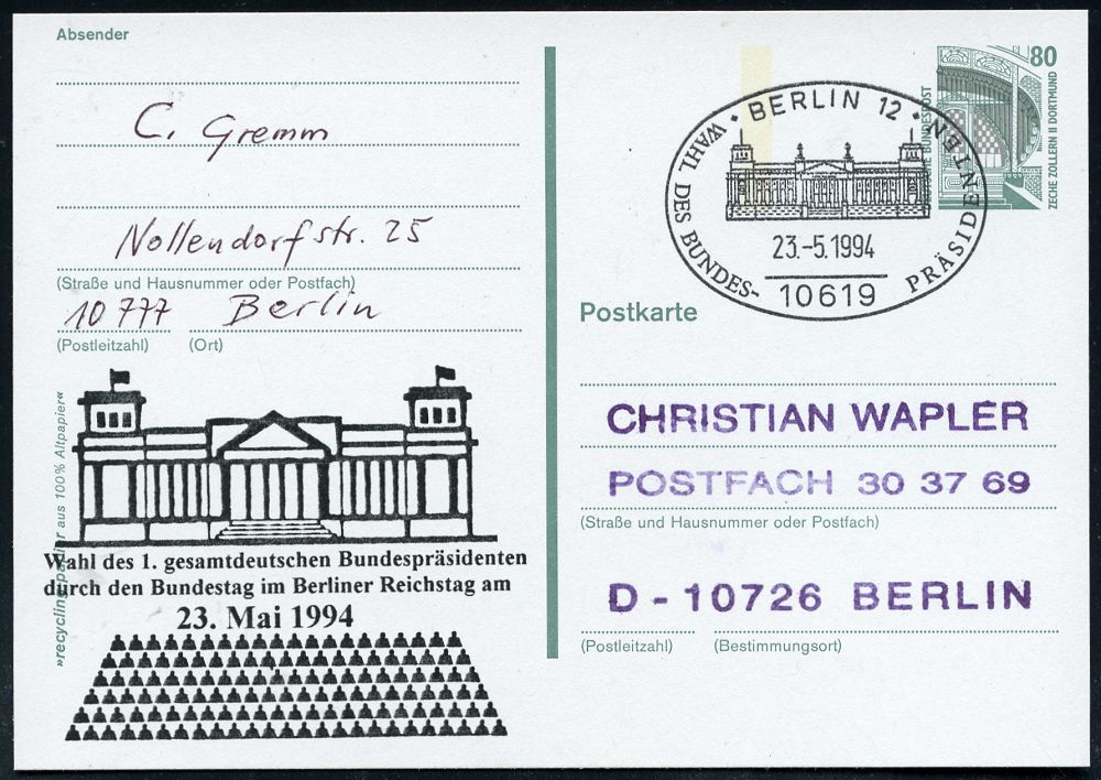4004 | 15 € | GESCHICHTE VON BERLIN : 10619 BERLIN 12/ WAHL DES BUNDES-PRÄSIDENTEN 1994 (23.5.) SSt auf amtl. P 80 Pf. Bauwerke + Zudruck: Wahl 1. gesamtdeutschen Bundespräsidenten..Reichstag (Reichstag, Wahlmänner) Ortskt., Präsident = Roman Herzog (Mi.PZD 150, Aufl. nur 50 Stück) | ![]() | |