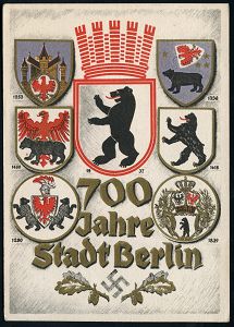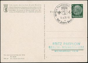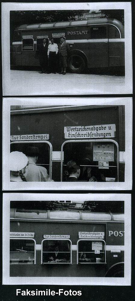 3943 | 20 € | GESCHICHTE VON BERLIN : BERLINFAHRBARES POSTAMT/ c/ 700 Jahre Berlin 1937 (16.8.) SSt auf EF 6 Pf. Hitler "Kulturspende" (Mi.648, EF + 25.- EUR) auf Color-Sonderkarte: 700 Jahre Berlin (Berliner Wappen) Bedarf + 3 Faksimile-Fotos mobiles Postamt (Bo.234 c) | ![]() ![]() ![]() | |