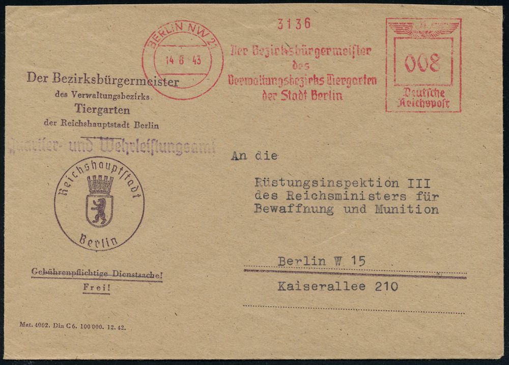 3948 | 18 € | GESCHICHTE VON BERLIN : BERLIN NW 21/ Der Bezirksbürgermeister/ des/ Verwaltungsbezirks Tiergarten.. 1943 (14.8.) AFS Francotyp auf Orts-Dienst-Bf.: Reichshauptstadt Berlin (Wehrleistungsamt) an Rüstungsinspektion III (Dü.E-5CEh) | ![]() | |