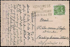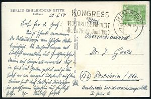 3968 | 14 € | GESCHICHTE VON BERLIN : (1) BERLIN SW11/ ai/ KONGRESS/ für/ KULTURELLE FREIHEIT/ ..26.-30.Juni 1950 (20.5.) seltener MWSt , klar gest. s/w.-Foto-Ak.: Rathaus Bln.-Zehlendorf, Bedarf (Bo.449 A I) | ![]() ![]() | |