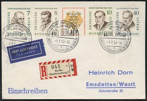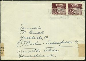3983 | 15 € | GESCHICHTE VON BERLIN : Berlin-Dahlem 1957 (3.7.) frankierter Dienst-Bf.: ÖSTERREICHISCHE DELEGATION , 4er-Bl. 5 Pf. LPD , Fernbf. in die DDR n. Karl-Marx-Stadt! (Mi.141 MeF) | ![]() | |