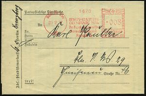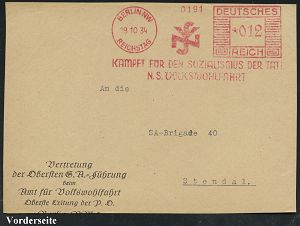 3940 | 40 € | GESCHICHTE VON BERLIN : BERLIN NW/ REICHSTAG/ NSV/ KÄMPFT FÜR DEN SOZIALISMUS DER TAT/ N.S.VOLKSWOHLFAHRT 1934 (19.10.) sehr seltener AFS Francotyp = Hauspostamt der NSV im Reichstag , Vordruck-Vorderseite:: Vertretung der Obersten S, A.-Führung.., nur wenige Monate verwendet! (Dü.E-2Ah im Reichstag) | ![]() | |