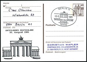 3997 | 15 € | GESCHICHTE VON BERLIN : 1000 BERLIN 12/ UNTEILBARES DEUTSCHLAND/ 30.Kongreß 1985 (8.6.) SSt = Brandenbg.Tor auf amtl. P 40 Pf. Burgen + motivgl. Zudruck: UNTEILBARES DEUTSCHLAND/30. Kongreß mit Mauerbau an der Bernauer Straße (Mi.PZD 121) Ortskt., nur wenige Belege! (Bo.2356) | ![]() | |