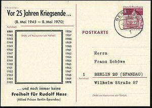 3993 | 12 € | GESCHICHTE VON BERLIN : 1 BERLIN 20 1970 (8.5.) 1K auf Orts-P. 8 Pf. Kaub + Zudruck: Vor 25 Jahren Kriegsende u.immer noch keine Freiheit für Rudolf Hess (Allied Prison Spandau) Orts-Kt., Hess starb im Gefängnis, das danach abgerissen wurde! (Mi.PZD 76) | ![]() | |