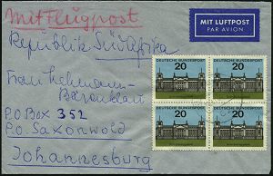 4017 | 15 € | GESCHICHTE VON BERLIN : B.R.D. 1964 (23.11.) 20 Pf. Reichstag, Berlin, reine MeF: 4er-Block (Reichstag ohne Kuppel), klar zentr. gest. (62 Wiesbaden) Übersee-Flp.-Bf. n. Südafrika (Mi.421 MeF) | ![]() | |