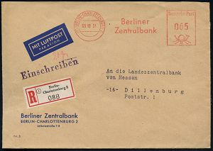 3974 | 25 € | GESCHICHTE VON BERLIN : (1) BERLIN-CHARLOTTENBURG/ Berliner/ Zentralbank 1951 (5.10.) AFS Francotyp 065 Pf. + RZ: (1) Berlin-/Charlottenburg 2/g , Firmen-Bf., seltener Inl.-Flp.-R-Bf. n. Dillenburg (Dü.E-20CO) | ![]() | |