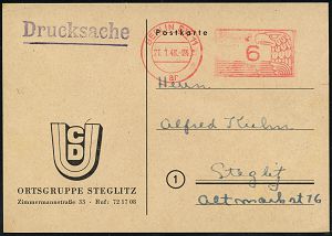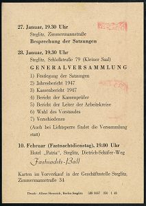 3961 | 18 € | GESCHICHTE VON BERLIN : BERLIN SW 11/ ar 1948 (11.1.) aptierter PFS "Adler/Hakenkreuz", mit NS-Adler, Hakenkreuz = entfernt , Einladungskarte: CDU, ORTSGRUPPE STEGLITZ zur Genralversammlung + Fastnachts-Ball (Dü.D-8, Nr.229) | ![]() ![]() | |