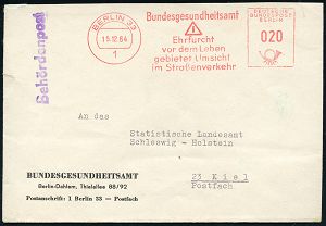 3991 | 18 € | GESCHICHTE VON BERLIN : 1 BERLIN 33/ Bundesgesundheitsamt/ ..Umsicht/ im Straßenverkehr 1964 (15.12.) AFS Francotyp (Schild "Gefahr") + viol. 1L: Behördenpost, Dienst-Bf: BUNDESGESUNDHEITSAMT.. (kl. Seitenrißchen), Fernbf. (Dü.E-24CO) | ![]() | |