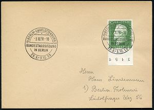 3984 | 18 € | GESCHICHTE VON BERLIN : (1) BERLIN W 15/ Bundeshaus/ Berlin 1958 (13.3.) AFS Francotyp auf aptiertem Dienst-Bf.: DER BUNDESMINISTER für wirtschaftl. Zusammenarbeit/Vertretung Berlin überschrieben: "Besitz des Bundes", seltener Ortsbf. (Dü.E-24CO) | ![]() | |