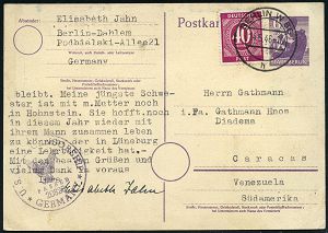 3951 | 30 € | GESCHICHTE VON BERLIN : BERLIN W 66/ h 1946 (14.5.) 2K-Steg auf Inl.-P. 6 Pf. "Stadt Berlin" (Bär) + Zusatzfrankatur 40 Pf. Ziffer Kontrollrat (Mi.929) + viol. US-Zensr-1K: U.S. MILITARY CENSORSHIP/ PASSED/20826 = Offenbach aus Berlin-Dahlem, seltene Übersee-Zensur-Kt. nach Caracas, Venezuela!, sehr seltene Destination! (Mi.P 4) | ![]() ![]() | |