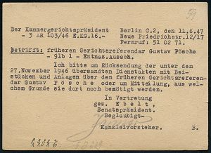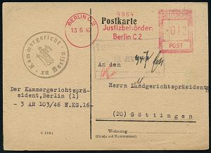3958 | 18 € | GESCHICHTE VON BERLIN : BERLIN C 2/ Justizbehörden.. 1947 (13.6.) AFS Francotyp "Hochrechteck" + viol. 1K-HdN: Kammergericht zu Berlin = Ost-Berlin ! (Justitia) Dienst-Kt. = Entnazifizierunssache n. Göttingen! (Dü.E-18DGh, nur 1 1/2 Jahre verwendet) | ![]() ![]() | |