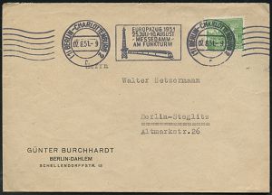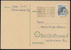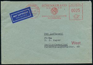 4009 | 18 € | GESCHICHTE VON BERLIN : (24a) HAMBURG 1/ SCHENKER & CO.. 1952 (21.11.) AFS Francotyp, vierstellig 0025 Pf. (Logo der Spedition: Globus) + Zusatz: Per Luftpost! + roter 1L: W e s t , Inl.-Flp.-Bf. n. West-Berlin (Dü.E-23, Nr.404 = seltene Type) | ![]() | |