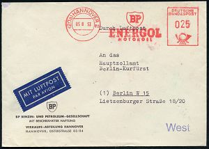 4010 | 16 € | GESCHICHTE VON BERLIN : (20a) HANNOVER 2/ BP/ ENERGOL/ MOTOROEL 1953 (5.8.) AFS Francotyp 025 Pf. + viol. 1L. W e s t , Firmen-Flp.-Bf.: BP an Haupt-Zollamt West-Berlin (Dü.E-23CO) | ![]() | |