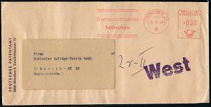 4011 | 16 € | GESCHICHTE VON BERLIN : 8 MÜNCHEN 26/ Bundespatentbehörden/ München 1969 (15.9.) AFS Francotyp + gr. viol. 1L: W e s t , Dienst-Bf.: DEUTSCHES PATENTAMT.. n. West-Berlin (Dü.E-26) | ![]() | |