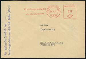 4013 | 18 € | GESCHICHTE VON BERLIN : 8231 SCHNEIZLREUTH/ Erprobungsstelle 52/ der Bundeswehr 1969 (28.7.) AFS Postala + viol. 2L: Nur nachsenden innerhalb des/Bundesgebietes ausschlißlich Berlin (West) , Berlin unterlag nicht der bundesdeutschen Wehrhoheit !, Bundeswehr-Dienst-Bf. n. Würzburg (Dü,E-26B) | ![]() | |